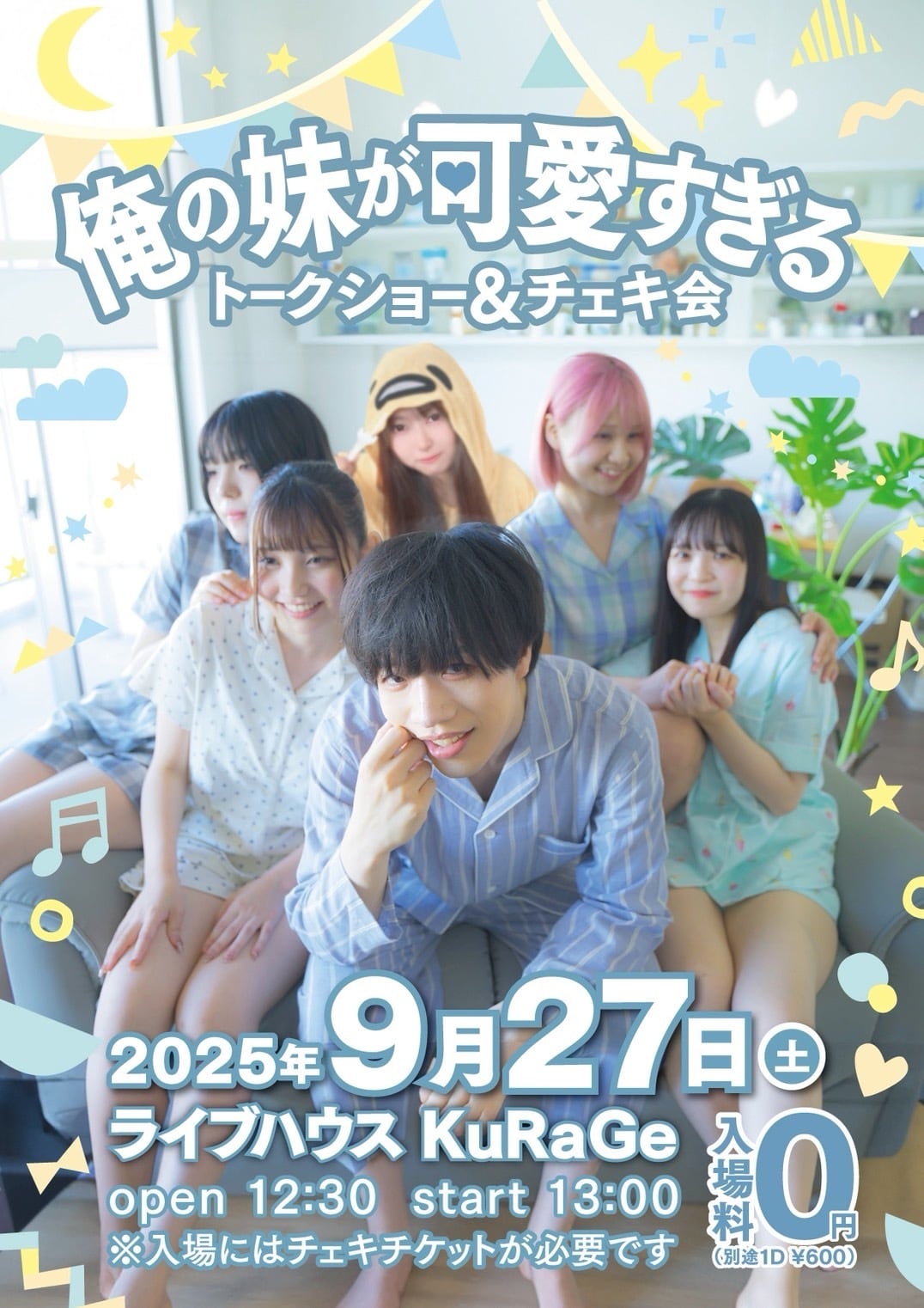 ⚪イベント概要 「俺の妹が可愛すぎるトークショー&チェキ会」 日時:2025年9月27日(土) open 12:30 / start 13:00 会場:ライブハウス KuRaGe 住所:〒542-0083 大阪府大阪市中央区東心斎橋1丁目13−3 5階 ⚪料金 入場料無料!(別途1D600円) チェキ1枚あたり 1,100円 今回は特別価格!!ソロチェキの代金でツーショットも撮影できます!◎ ⚪受け渡し方法 当日、受付で【購入完了メール】をご提示ください。 その場で引換券をお渡しします! ⚪主催者コメント 「初めてのトークショー&チェキ会を、みんなと一緒に成功させたいです!ぜひ応援よろしくお願いします!」 ⚪注意事項 1人で50枚達成に至らなかったメンバーは不参加となります。 ご購入いただいた方には随時返金させていただきますのでご安心ください。